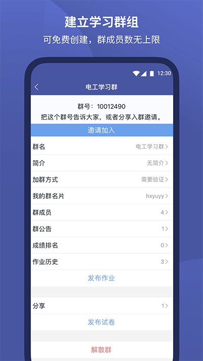 2、群组功能,在群组内发布作业或分享,发布试卷,支持公开或私密方式。