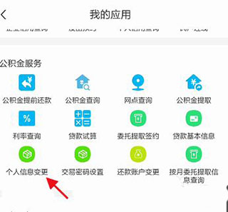4、进入我的应用,找到公积金服务,点击下方的个人信息变更进入。