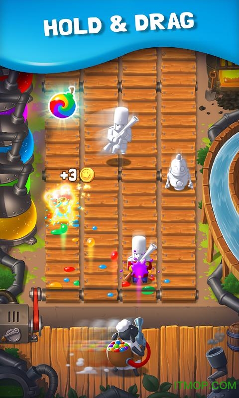 当玩具沿着生产线滑行时,请将颜料泼洒在过往的玩具上.