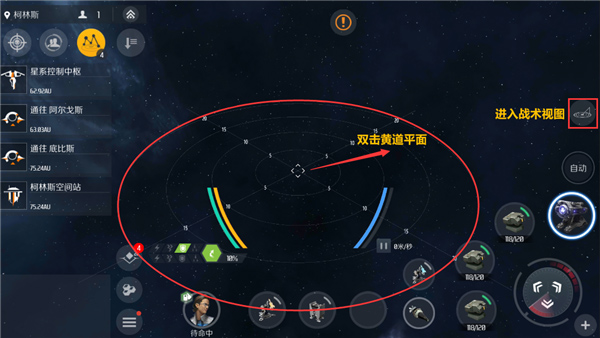 3、第二种自由飞行的方式有些类似RTS游戏的操控,首先点击屏幕右侧的战术视图按钮进入上帝视角,此时摄像机会自动拉远,并在屏幕正中浮现一个黄道环。