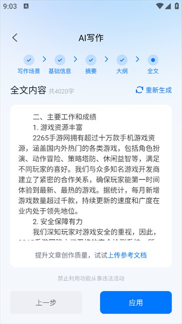 6.可看到具体生成的全文,如有需要,点击应用即可