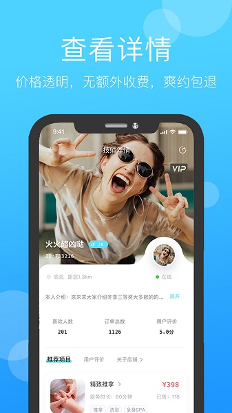 2、支持按摩推拿、减压SPA、足疗足浴等服务选项,支持技师人员信息查看,帮助随时缓解身心疲劳;