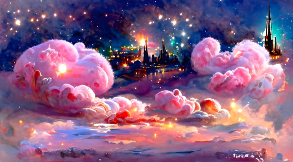 4、梦幻的夜空,闪烁着星星,巨大的粉色桃子云彩,远处的高塔和迷你城市。(CG渲染)