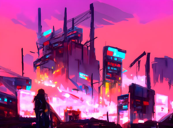 2、近处是燃烧的垃圾场,随处可见的电子设备,远处是挂满霓虹灯高楼林立的城市。(CG渲染、赛博朋克)
