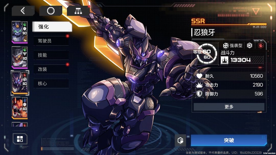 总评:作为本次测试唯一一台有着专属池子的机体,忍狼牙的表现,可以说是完全匹配得上它的身价,格斗机在本次测试中的表现本身就优于射击机,而忍狼牙的技能组配置,又与布兰卡这类机师的精神技相当适配,虽说基础技能的攻击范围在格斗机中并不优秀,但作为输出,忍狼牙的火力对比其他机体,有着压倒性的优势,高攻击段数能更快地积攒精神技和必杀槽,精神技期间,可以与分身一同,不依靠他人达成合击增伤,必杀更是在有着高倍率的同时,还有着成长机制,可以说,是本次测试中,最强的金机体