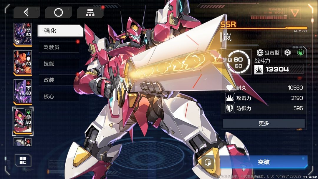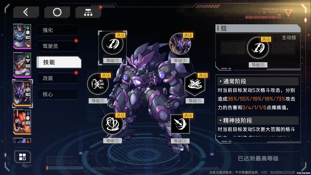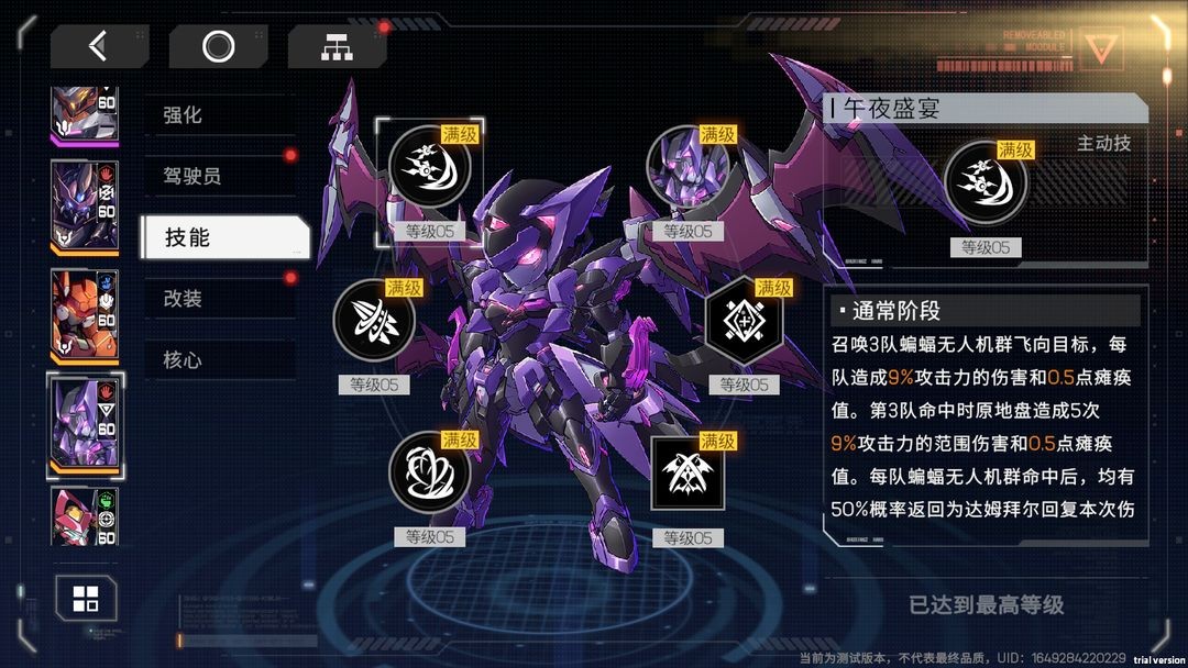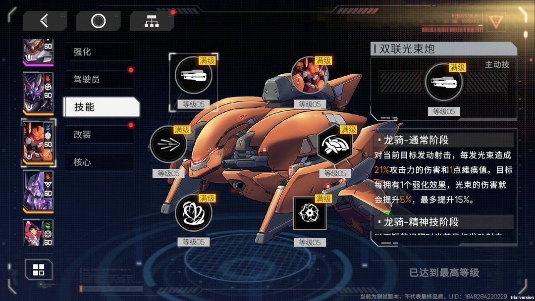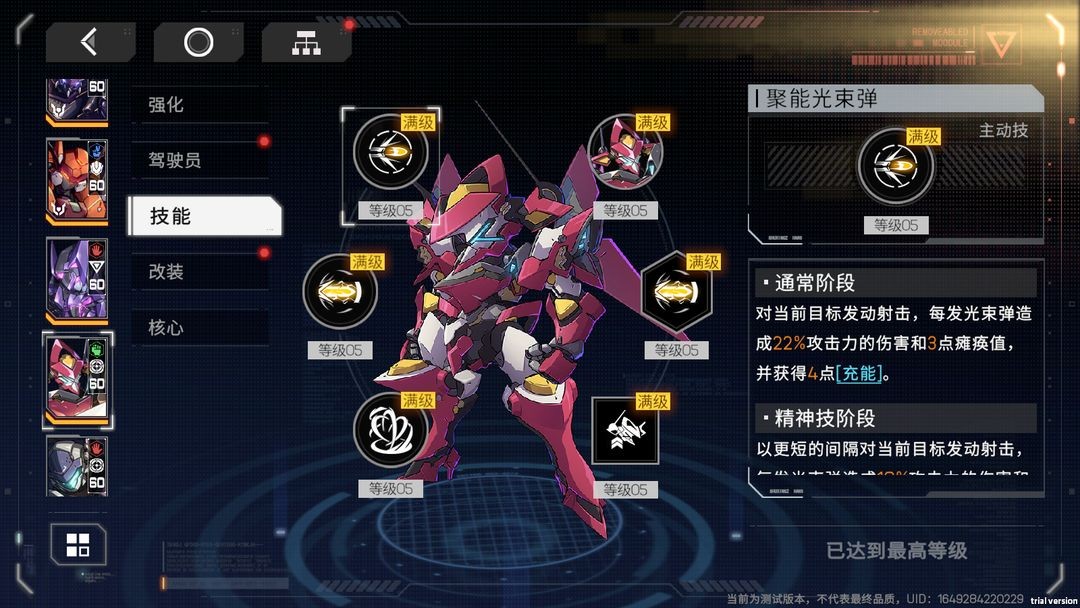 评价:功能性支援技,回血的同时提供锁血,但是目前用途不大,测试版本的关卡,敌人的强度还未高到需要锁血的地步,至于回血,可以靠机师的精神技,或其他机甲的技能,当然,单论回血量还是挺可观的,因为支援位的达姆拜尔,可以直接装备增加最大耐久的改装件,来显著提高回复量