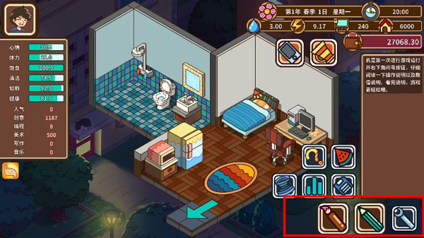 5、马桶:上厕所。游戏设定会自动上厕所,时间依然会消耗。所以一般情况下不需要玩家点击上厕所。