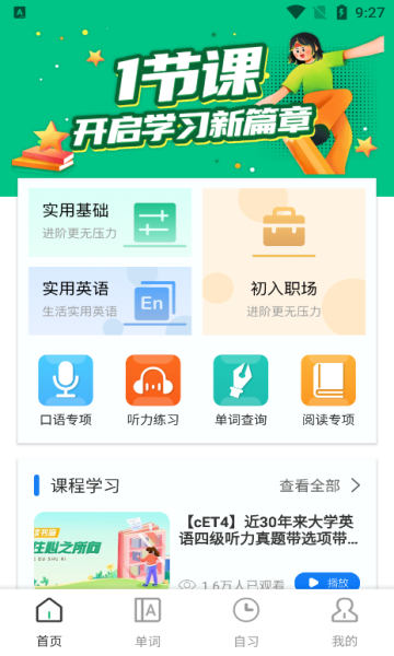 听力练习、单词查询、口语专项、商务英语等,功能,听说读写,全面辅助!想要提高英语水平?不要担心!