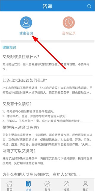 3、打开咨询页面,有健康咨询、咨询记录和健康知识栏目,用户可以点击健康咨询,填写性别、年龄以及症状描述然后点击右上角开始咨询;