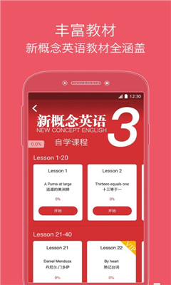 每天读一点英文app整理了新概念英语自学教程系列课本,用户可以在其上进行在线自学,同时分不同学习阶段,分为初级英语、高级英语、中级英语、与VOA新闻听力,逐级递增,为用户学习带来了巨大的帮助,帮助用户解决英语学学习过程中的问题,是一款由权威英语教育机构和多位名师联合打造的专业英语学习软件!