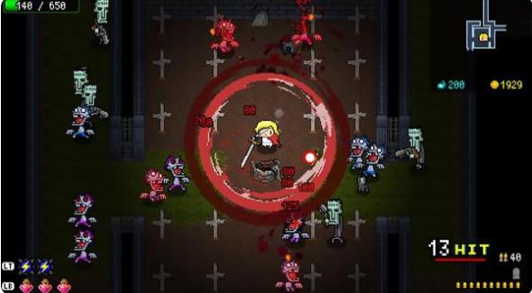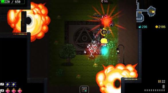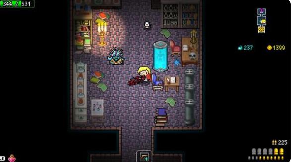 游戏整体节奏还算是比较快地,玩起来感觉有些爽快。玩法跟传统地牢类游戏,特别是同类型的带有roguelike元素的2D射击游戏差不多。所有关卡中的地图全都是随机生成,人物能够携带近战武器和远程武器两种,在流程中玩家可以通过收集怪物掉落的以及开宝箱获得的宝物提高角色的属性。