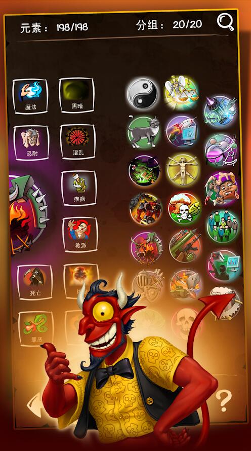 游戏共有157个元素等待玩家去合成,越往后面玩,组合难度越大,选择和花样也会越多!游戏中内置虚拟金币,玩家每次组合成功新元素都会出现与该元素相关的名人名言;使用提示会消耗金币;而成功合成元素也会消耗一定金币;当然你还可以去恶魔老虎机上试一试手气,但只有出现[邪恶]的图标组合时,才会增加金币.赶快来加入涂鸦恶魔的队伍吧!尽可能去摧毁一切,让宇宙的事物保持平衡,我们会逐渐添加新的元素.