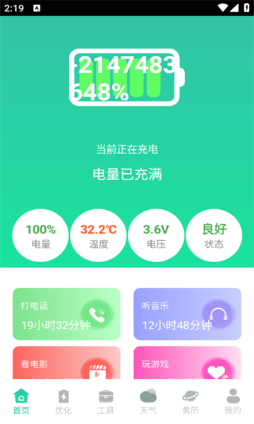 检测电池寿命,随时了解电池健康状态。根据黄历提示,选择适合的日子充电,有助于延长电池使用寿命。