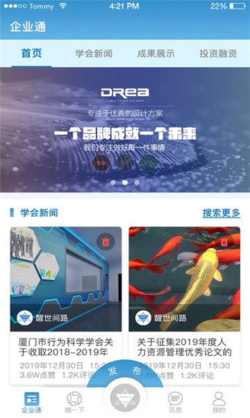 个人可以在企业通和啪一下系统模块快速发布学会新闻、成果展示、话题、趣事、视频、政策与投融资信息共享交流;
