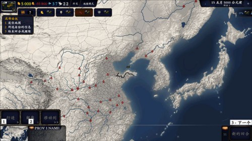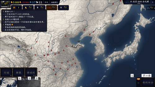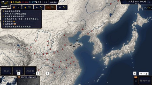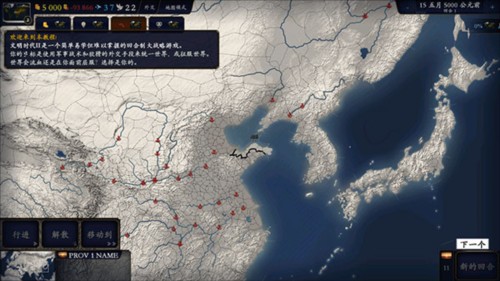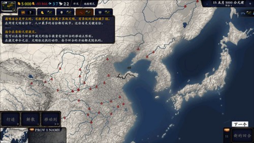 7、底部面板还有3处重要信息:1迷你地图;2所选省份的信息;3结束回合或继续。当你发出回合内的所有指令后,就可以点击右下角按钮结束本回合。