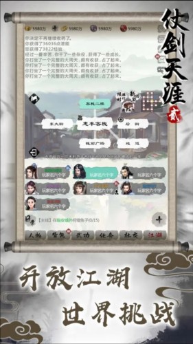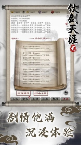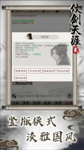 仗剑天涯2是一款非常受欢迎的文字冒险类武侠角色扮演手游。该游戏以文字的方式将丰富的剧情展现出来,带玩家进入一个真实的武侠世界中。进入游戏,玩家将扮演一位初如武侠世界的少年,玩家可以学习各种武学招式,探索任务系统,遇到不同的奇遇,获得丰厚的奖励。同时玩家可以不断地收集装备强化升级角色等级,逐步成为一代武侠。