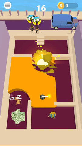 在游戏中我们将扮演一个小偷并带领我们的伙伴抢劫银行。我们要把银行里的钱都抢光,然后成功逃走,在这个过程中,我们要找一条合适的路线,顺利挖一条通往金库的路,注意不要打扰警卫!