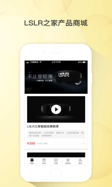 LSLR下载分享给大家。LSLR之家产品商城,每周都会给用户们带来各种有奖活动,你可以智能语音控制,更有LSLR之家详尽的个人中心!LSLR智能眼罩,时尚生活,赶紧下载吧!