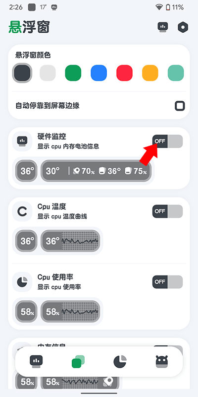 2、接着按照自己的需求开启相应的硬件检测悬浮窗并赋予软件悬浮窗口权限即可