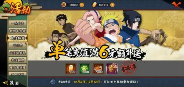 固定一些时间会出一些充值特惠,比如单笔6元充值送 300金币+1000声望+300体力+b忍碎片*5任选其一