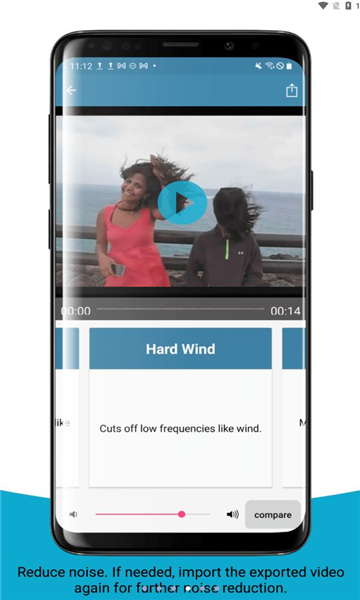 3.从多个降噪滤波器中进行选择,以消除嘶嘶声,风和其他噪声,从而立即清洁音频。按住“比较”可听到与原始图片的不同之处。按住过滤器可绕过,因此您只能听到音量的变化。